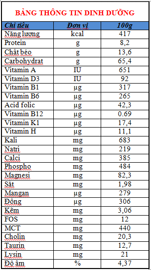 Thành phần cấu tạo : Sữa bột béo, Sữa bột gầy, Non-dairy creamer (bột kem béo thực vật), Energy, Protein, Fat, Carbohydrates, Vitamin A, Vitamin D3, Vitamin B1, Vitamin B6, Folic acid, Vitamin B12, Vitamin K1, Vitamin H, Potassium, Sodium, Calcium, Phosphorus, Magnesium, Iron, Copper, Zinc, FOS, MCT, Choline, Taurine,