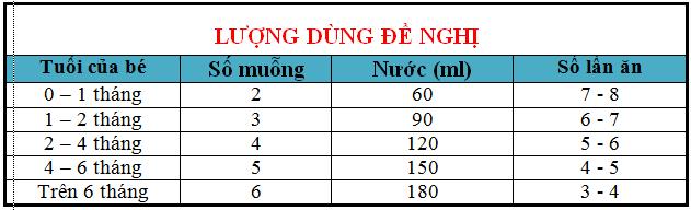 (Chú ý: Bảng lượng ăn đề nghị chỉ mang tính chất tham khảo, có thể điều chỉnh lượng ăn theo nhu cầu của mỗi bé)