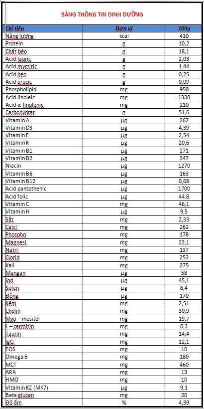 Thành phần : Sữa bột béo, Sữa bột gầy, Non-dairy creamer (bột kem béo thực vật), Energy, Protein, Fat, Lauric Acid, Mystiric acid, Fatty acids, Erucic acid, Phospholipids, Linoleic acid, Acid α-linolenic, Carbohy-drates, Vitamin A, Vitamin D3, Vitamin E, Vitamin K (K1), Vitamin B1, Vitamin B2, Niacin, Vitamin B6, Vitamin B12, Pantothenic acid, Folic acid, Vitamin C, Vitamin H, Iron, Calcium, Phosphorus, Magnesium, Sodium, Chloride, Potassium, Manganese, Iodine, Selenium, Copper, Zinc, Choline, Myo – inositol, L – camitin, Taurin, IgG, FOS, Omega 6, MCT, ARA, HMO, Humidity, Hương vanilla tổng hợp dùng trong thực phẩm.